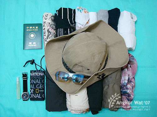 我的行李通常很小一包,一切以精簡為主。衣服都是用捲的,相信我這樣的方式,襯衫也不會皺皺滴!這次柬埔寨之行帶些什麼呢?12月滴柬埔寨氣溫平均約26度。白晝溫差大,中午大約有30度以上的高溫,熱到汗流浹背,不小心還是會小曬傷。清晨與太陽下山候會有點冷,小莎挺喜歡兩件式的穿法,套一件薄襯衫,怕曬太陽的人可以遮陽,晚上穿剛好保暖唷。