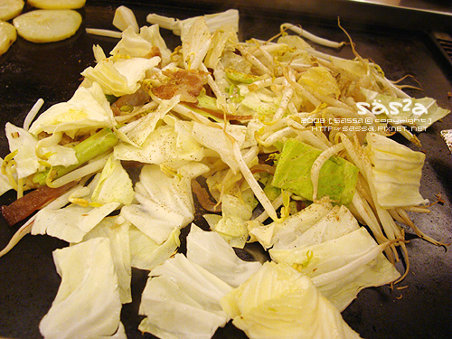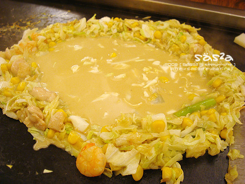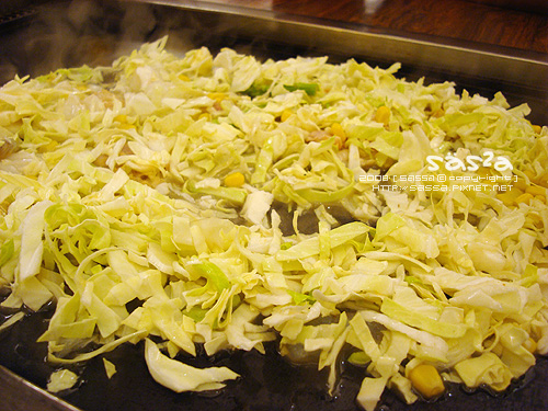 『月島文字燒』180元。先將花枝、蝦子、豬肉、雞肉在鐵板上爆香,加上高麗菜絲、玉米粒炒用兩支鏟子充分的拌炒,麻糬放在鍋面側邊加熱不翻動。喜歡自己動手的人可以自己煮,像我有點懶呢,就讓服務生幫我炒囉!