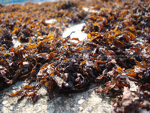路旁人家庭院前曬著大片深褐色滴植物,同事說這是寒天。陽光下,寒天反射出漂亮的顏色,身上閃著點點繁星滴白色結晶體,那是海鹽唷。