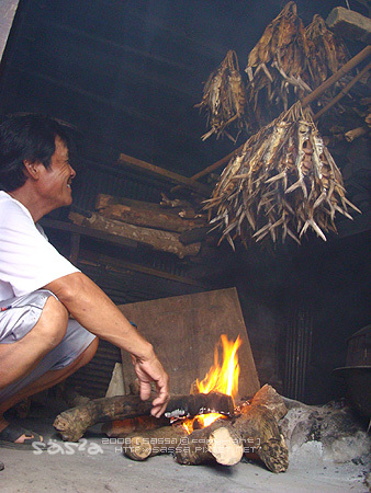 飛魚吃法,有新鮮滴、一夜乾還有飛魚乾。施爸正在煙燻他滴飛魚呢!將吃不完滴新鮮飛魚吊掛在小倉房裡以木頭煙燻,便可保存飛魚一直到十月為止。十月過後吃不完的飛魚就要通通丟棄囉!這樣才不會招來疾病。
