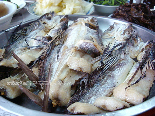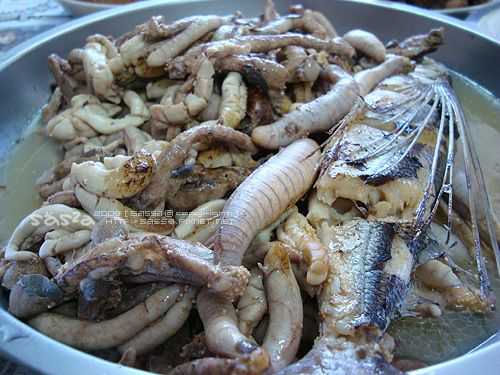 哈!這是我給這料理取的名字。這一大盤阿,有新鮮的飛魚、飛魚卵、飛魚肝以及飛魚膘。最好吃滴部位捏,施爸施媽還有我們大夥一致認為是飛魚膘,軟軟QQ滴像是海洋來滴魚豆腐。飛魚肝會有一點小小苦滴味道。飛魚卵一粒粒滴在嘴裡彈跳ㄦ。