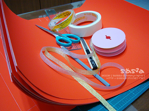 我買了全開的銅板紙,磅數很高也就是紙張很厚的意思,精確滴丈量好我要的包裝袋大小,在折線上用美工刀刀背劃痕,這樣一來再厚的紙都可以折的漂漂亮亮滴!這種大紅色滴銅板紙雙面都是紅色,而且像紅包袋那樣有香香滴味道。