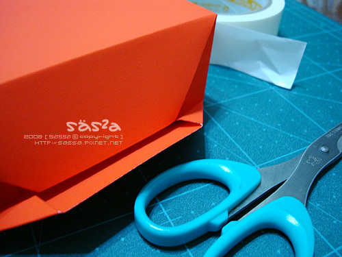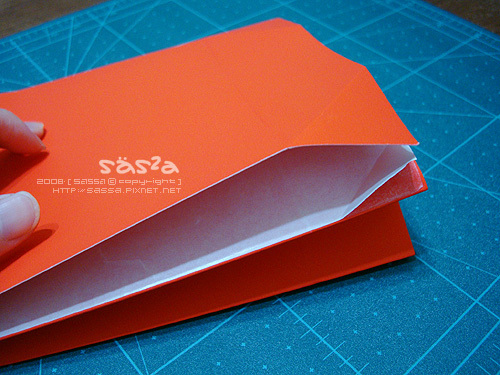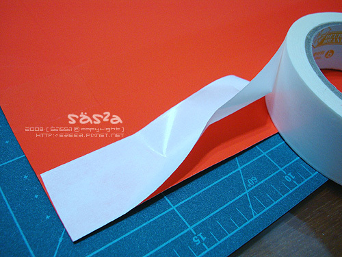 將大紅色滴銅板紙按照折線通通折好,撕開雙面膠準確滴對好黏合上。