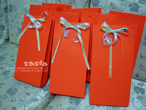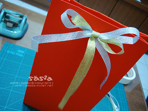 耶!大功告成了!超開心的咧!把沒有包裝盒的拖鞋,包成漂漂亮亮滴大紅禮,真是很有成就感啊!呵呵!銅板紙很挺配上金銀緞帶真滴好美唷!材料便宜又可以達到喜氣滴效果,真滴很讚ㄟ。