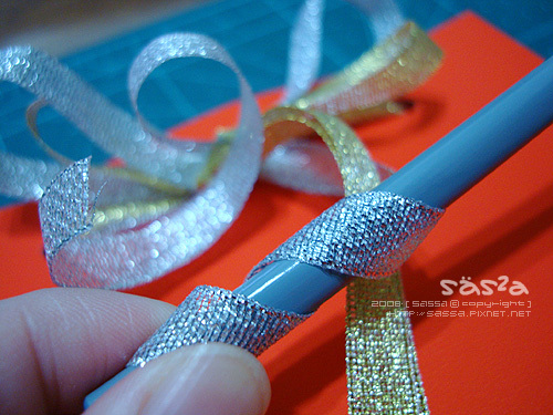 用鉛筆把銀色滴緞帶捲一捲,金色滴緞帶不用捲讓它呈現直的。