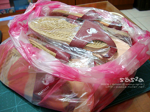 當啷!今天要包裝的是古早滴真皮拖鞋。這項指定商品還真滴是不好買,找了好久大賣場也迷有。我記得是小時後這拖鞋很貴哩!男鞋是咖啡色滴,女鞋是紅色滴,Play Boy兔寶寶代言,這年頭改大象當代言啦!