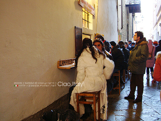 除了牛排,佛羅倫斯的另一個特產是牛肚,在佛羅倫斯的大街小巷都有賣這種極庶民的牛內臟料理。將大塊牛肚煮得酥爛,切成條,單吃或是切成條,夾在麵包裡,配托斯卡尼無糖麵包與紅酒就很讚阿!但丁故居旁邊便有一家,在當地頗有名氣,大夥都站在牆邊或是做著吧檯椅享用著。我們有經過@@沒時間停下買來吃,嗚!好殘忍!