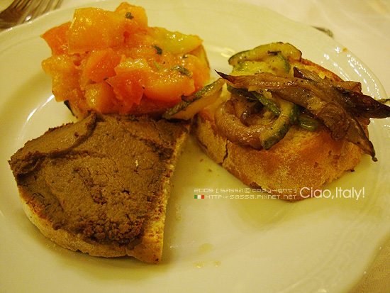 這道小拼盤我超愛吃的耶!三種料理配上麵包都好正點,很適合台灣夏天拿做輕食。番茄加上鹽、菜末、橄欖油調味簡單的調味更顯出田園風味。左邊這個爆好吃的燒烤雞肝醬裹麵包,雞肝口感,卻夾雜濃濃的牛肉味,超合我胃口。右邊的是櫛瓜炒牛肚,不知怎麼弄的就是很搭,櫛瓜口感有點像大黃瓜般,牛肚燉的軟爛,好想拿來配飯XDDD