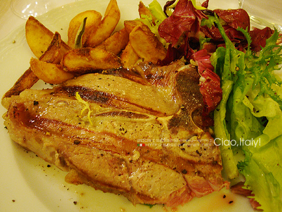 我期待這白牛肉很久,終於給我盼到惹!佛羅倫斯的牛排多是宰殺,之後不經冷凍,而以冷藏數日讓肉質變軟,吃時要將丁骨部分的牛肉切成五公分厚,吃佛羅倫斯大牛排是以公克計算,通常一塊牛排都800g以上,換算的話600g等於21盎斯,很巨大的,不過我覺得我們的牛排好像有修小過。
