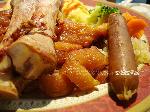 夢時代美食街好多我想要吃滴,老公建議吃德國豬腳,現在買德國豬腳送一蛋包飯一份,兩個人吃將將好。脆皮豬腳很好吃,外表烤的金黃香酥,瘦肉部份不乾不澀又軟嫩,脆皮與瘦肉之間夾著一層豬肥肉,豬肥肉高溫烤過,呈現香滑口感,一點也不油膩,豬皮、豬油花、豬瘦肉,搭再一起超好吃滴,配上酸菜、黃芥末會一塊接著一塊。