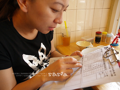 果真大客滿,許多人正等待座位,一會兒一對老夫妻用完餐正要離開,幸運滴我們很快的坐在冷氣的座位,先偷瞄其他客人都點些啥,在來研究一下菜單囉!哇!好便宜啊!