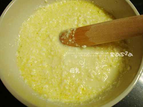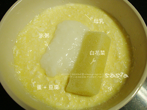 加入一些母乳。其實不加也沒關係,因為豆腐裡含有很多水分,也不用另外加水。
