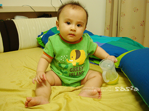 剛開始小柚子只是把學習杯拿來玩,我常故作喝水狀給小柚子看,幾天後,小柚子終於學會喝水,真沒想到喝水也是要學習訓練的,這種我們大人覺得很基本的事。