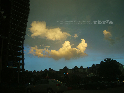下班時遇到一名單車騎士停在前方拿著單眼拍照,往他的方向看,有好漂亮的雲正發著光。原以為受到颱風氣流的影響會有大景,天空的雲層又厚又黑又低什麼也沒有。廣播說許多地方下起了大雨導致塞車要駕駛朋友小心,一邊播放著瘐澄慶的蛋炒飯問聽眾餓不餓,好在我先買了蔥油餅填肚。