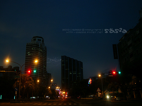 氣壓沒有帶來漂亮的火燒雲,帶來了似葉脈網般的漂亮閃電,一張接著一張鋪滿整個天空中。美麗的景象留在心裡了,抓一張小閃電代表,開車還是專心點比較安全。