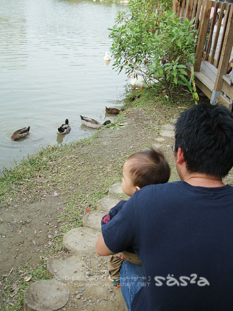 小柚子看著鴛鴦很認真,出乎意料的很乖巧,安靜的坐在柚子拔腳上,沒要衝下水抓鴛鴦XDDD。