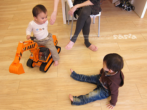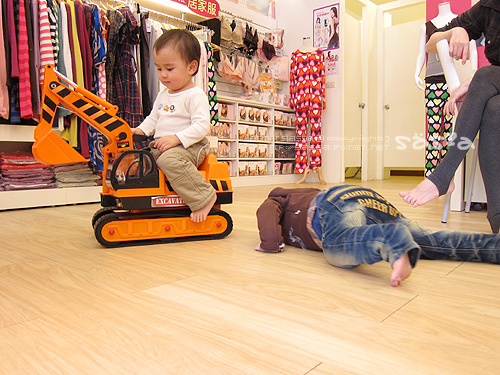 這天帶著小柚子上朋友的店裡聊聊,恰巧遇上朋友的兒子,仔仔大小柚子一歲左右。仔仔是個大方的孩子,將挖土機借給小柚子玩,整個過程中都沒有急著搶回去,還敎小柚子怎麼操作,媽媽真敎的很棒!