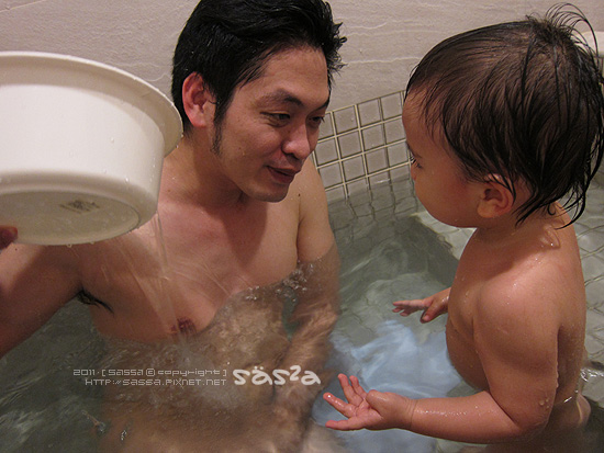 小柚子第一次泡湯,剛開始顯的緊張兮兮,在拔鼻的保護下,小子越來越得心應手。