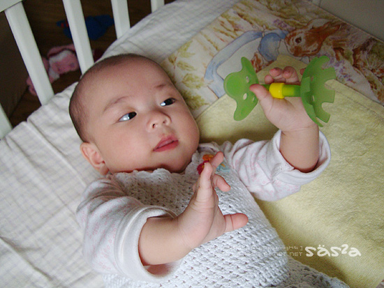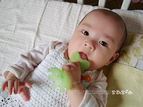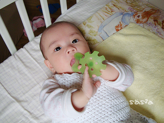 有天柚子拔問我『小麻醬該玩玩具了吧?小柚子這時期不知玩多少玩具了!』噗!!!我的老天爺,不是我不給小麻醬哩!這小花固齒器是我第一個拿給小麻醬的玩具(每晚好忙的kaloo兔不算),小花不知被我反覆洗好過熱水幾次,每次弄好,小柚子就想玩@@,唉!然後拿一堆小麻醬還不會玩的玩具丟在嬰兒車裡說要給小麻醬玩,冏!