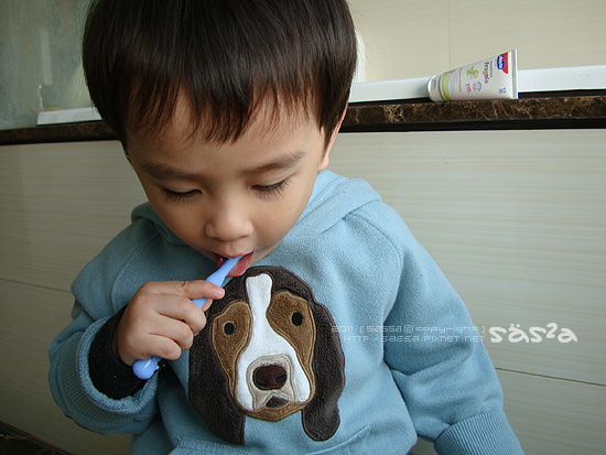 關於刷牙這件事在小柚子身上一直進行的很順利,不咬牙刷不吸牙刷,該張嘴就張嘴,配合的很。在很小的時候...嗯...大概一歲多左右,小柚子看著我們刷牙也吵著要刷,那時候小柚子只有八顆牙,而媽媽我並沒有很認真的幫小柚子刷牙,就在小柚子吵著刷牙之後,柚子拔幫小柚子買惹人生第一條牙膏,透明無味的嬰兒牙膏。