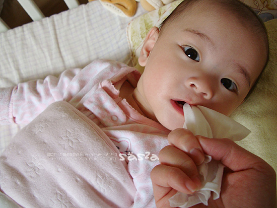 另外教我口腔減敏感訓練,將手洗乾淨放入小人口中按摩牙齦,上上下下按摩後逗弄舌頭,當小人開始吸允手指後,將手指抽出再放入,遊戲個幾次。經過幾次這樣的訓練之後,小麻醬真的開始不排斥奶嘴惹耶!有越來越好的趨勢,現在奶嘴碰到嘴唇小麻醬就會張口吸允而不是搖頭躲掉,能夠好好吸允奶嘴的小麻醬喝奶量也增加不少,真的好欣慰。之後每餐副食品後,我都使用濕紙巾跟小麻醬玩這個口腔遊戲,順便清潔口腔與牙齒,小麻醬很喜歡玩喔!這個訓練除了讓小麻醬再度願意好好吸奶之外,學習吃副食品也吞嚥的很快!喔~希望這個好現象能持續下去!
