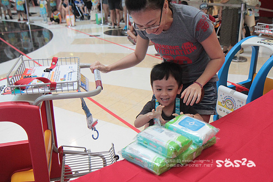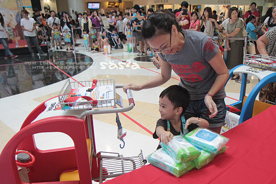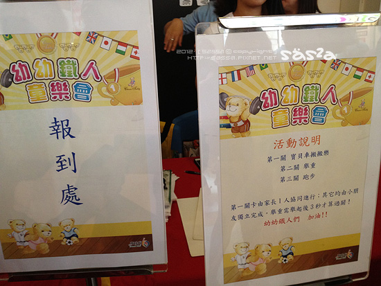 喔!講到這裡都是在講媽媽心情,沒介紹活動!!!這個活動很簡單,幼幼們需要過三個關卡,第一關:寶貝車搬搬樂,第二關:舉重,第三關:跑步。第一關由一位家長陪同幼幼一起推著寶貝車由幼幼搬濕紙巾上車回到起點,接著到第二關舉重三秒後,即可到達第三關奔跑至終點,即可完成!完成後每人可獲得證書。首先必須穿上主辦單位發的制服,噗!泳衣外穿!其實幼幼們一起醬子穿就一點都不奇怪反而很好看,哈哈哈!!