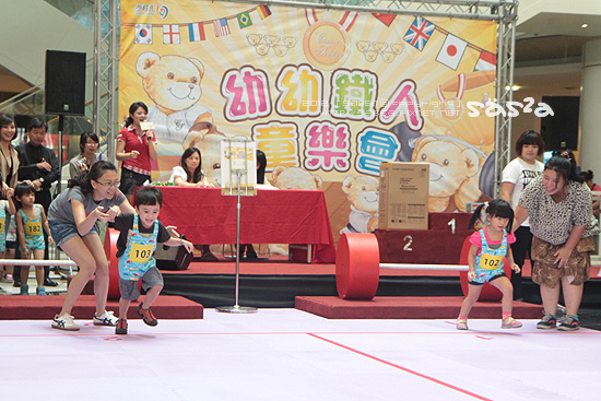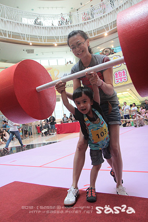 衝到第二關舉重,這個保麗龍做的大啞鈴,輕到不行,小柚子一把抓起又一把丟出去,好爆力阿!!媽媽我只好抓著小柚子的手,至少要舉高三秒才過關。
