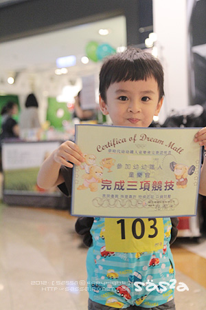 原本呢,是打算幫小麻醬上網搜尋爬爬比賽活動,因為小麻醬的爬爬終於比較穩,但很無奈的,小麻醬已經過大惹。後來看到夢時代的幼幼鐵人童樂會,年齡層寫的是3-4歲的幼幼,哇!我們小柚子還沒到,又看了看,疑!97-98年出生的幼幼!?這算是很妙的範圍,其實98年中過後的幼幼根本沒滿3歲。不過既然年底出生的小柚子也含在這個範圍內,當然要讓小柚子試試。