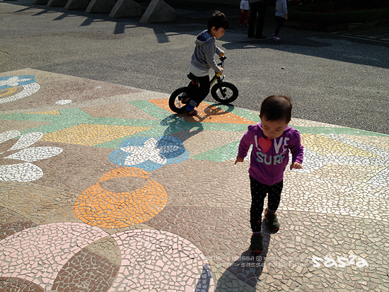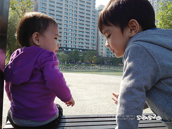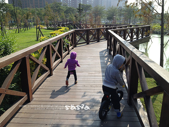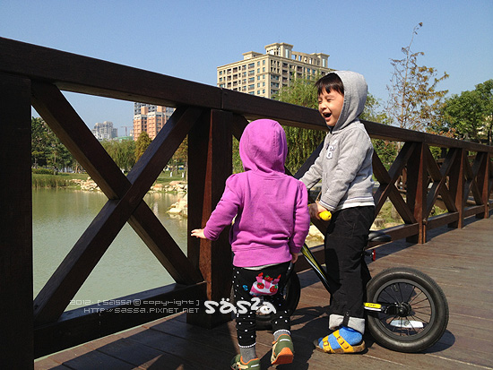 小人們很喜歡這裡,連續來了兩天的早晨運動。小柚子很喜歡水池中央的噴水,也很喜歡那些木造橋,除此之外也很喜歡滑著他的push bike串來串去,妹妹喜歡追著鴿子跑,也喜歡看著地上那些美麗的花。