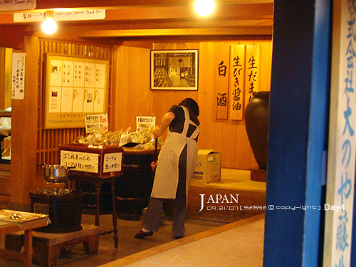 一長排細方格屋簷下,小水溝流水潺潺,造酒屋前掛著杉葉球的酒林,百年老店比比皆是,充滿著情趣的舖子鱗次櫛比,各式各樣的傳統陶瓷手工藝品、釀酒屋、味曾店、民藝品店、飲茶店、小餐館應有盡有,宛如電影中的佈景。